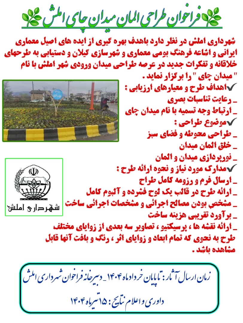 🔸صدای سکوت به گزارش روابط عمومی و امور فرهنگی شهرداری و شورای اسلامی،شهراملش شهرداری املش در نظر دارد باهدف بهره گیری از ایده های اصیل معماری ایرانی واشاعه فرهنگ بومی معماری و شهرسازی گیلان و دستیابی به طرحهای خلاقانه و تفکرات جدید در عرصه طراحی میدان ورودی شهر املش با نام ” میدان چای ” را برگزار نماید .