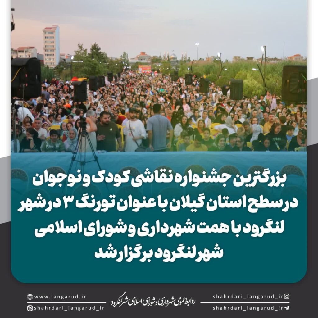🔸با همت شهرداری و شورای اسلامی شهر لنگرود سومین جشنواره و مسابقه نقاشی کودک با عنوان «تورنگ ۳» در پارک فجر شهر لنگرود با حضور بیش از ۲۰۰۰ هنرمند نقاش کودک و استقبال کم نظیر مردم لنگرود برگزار شد.