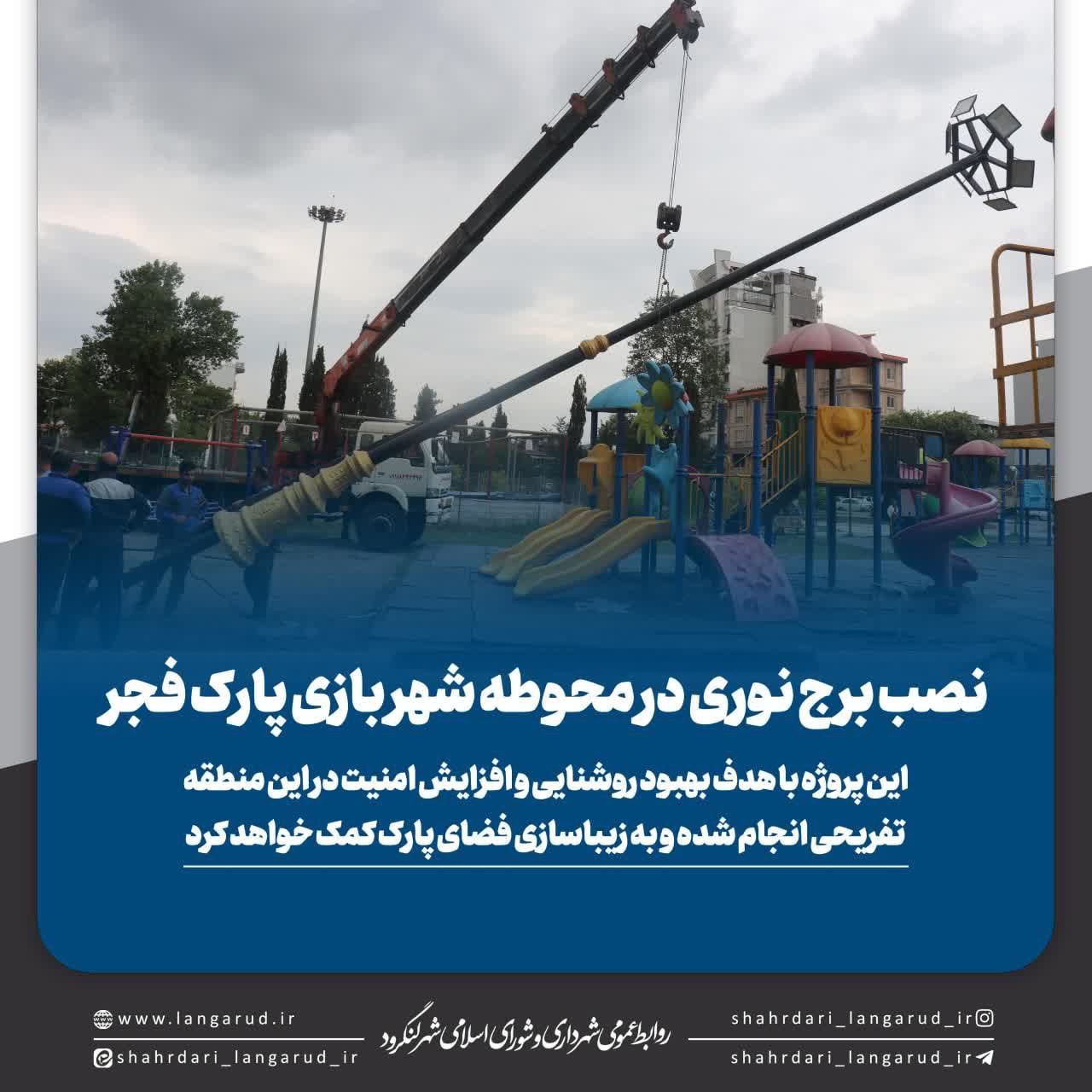 🔸صدای سکوت به گزارش روابط عمومی شهرداری و شورای اسلامی شهر لنگرود : شهرداری لنگرود اقدام به نصب برج نوری در محوطه شهر بازی پارک فجر کرده است. این پروژه با هدف بهبود روشنایی و افزایش امنیت در این منطقه تفریحی انجام شده و به زیباسازی فضای پارک کمک خواهد کرد. این پروژه به عنوان بخشی از برنامههای شهرداری برای ارتقاء کیفیت زندگی شهروندان و ایجاد فضایی امن و دلپذیر در پارک فجر در نظر گرفته شده است.