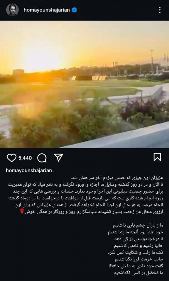 همایون شجریان ضمن تایید خبر لغو این کنسرت؛ در اطلاعیه ای نوشت:عزیزان آن چیزی که حدس میزدم آخر سر همان شد.تا الان و در دو روز گذشته وسایل ما اجازه ی ورود نگرفته و به نظر می آید که توان مدیریت برای حضور جمعیت میلیونی این اجرا وجود ندارد. جلسات و بررسی هایی که این چند روزه انجام شده کاری ست که می بایست قبل از موافقت با درخواست ما در دوماه گذشته انجام میشد. به هر حال این اجرا انجام نخواهد گرفت. از همه ی عزیزانی که برای این آرزوی محال من زحمت بسیار کشیدند سپاسگزارم. روز و روزگار بر همگی خوش.»او در واکنش به برحی نفرت پراکنی ها از سوی برخی افراد در داخل و خارج از ایران نیز ابیاتی را منتشر کرده است. او نوشته: « ما زِ یاران چَشمِ یاری داشتیم/ خود غلط بود آنچه ما پنداشتیم/ تا درختِ دوستی بَر کِی دهد/ حالیا رفتیم و تخمی کاشتیم/ نکته ها رفت و شکایت کس نکرد/ جانبِ حُرمَت فرو نگذاشتیم/ گفت خود دادی به ما دل حافظا/ ما مُحَصِّل بر کسی نَگماشتیم….