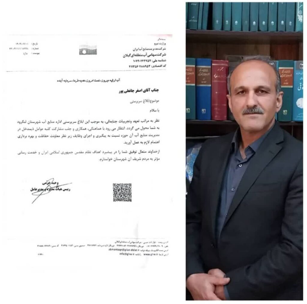 باسلام نظر به مراتب تعهد و تجربیات جنابعالی،به موجب این ابلاغ سرپرستی اداره منابع آب شهرستان لنگرود به شما محول میگردد.انتظار میرود با هماهنگی،همکاری وجلب مشارکت کلیه عوامل ذیمدخل در مدیریت منابع آب آن حوزه نسبت به پیگیری و اجرای وظایف زیر نظر معاونت حفاظت و بهره برداری اهتمام لازم به عمل آوردید.از خداوند متعال توفیق شما را در پیشبرد اهداف نظام مقدس جمهوری اسلامی ایران و خدمت رسانی مؤثر به مردم شریف آن شهرستان خواستارم.