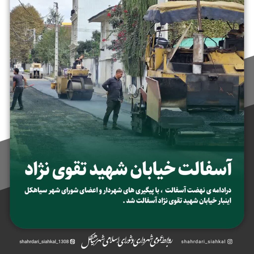 ب) نهضت آسفالت و بهسازی معابر:در ادامه برنامههای موسوم به “نهضت آسفالت”، خیابان شهید تقوینژاد به طور کامل آسفالت شد. این پروژه که از ابتدا تا انتهای این خیابان را در بر گرفته، با پیگیری مستقیم شهردار و اعضای شورای اسلامی شهر به مرحله بهرهبرداری رسیده است. علاوه بر این، واحدهای فنی شهرداری نسبت به ترمیم و لکهگیری آسفالت سایر معابر سطح شهر اقدام نمودند که این امر موجب کاهش خسارات خودرویی ناشی از برخورد با چاله ها، افزایش ضریب امنیتی تردد و کاهش آلودگی صوتی شده است.