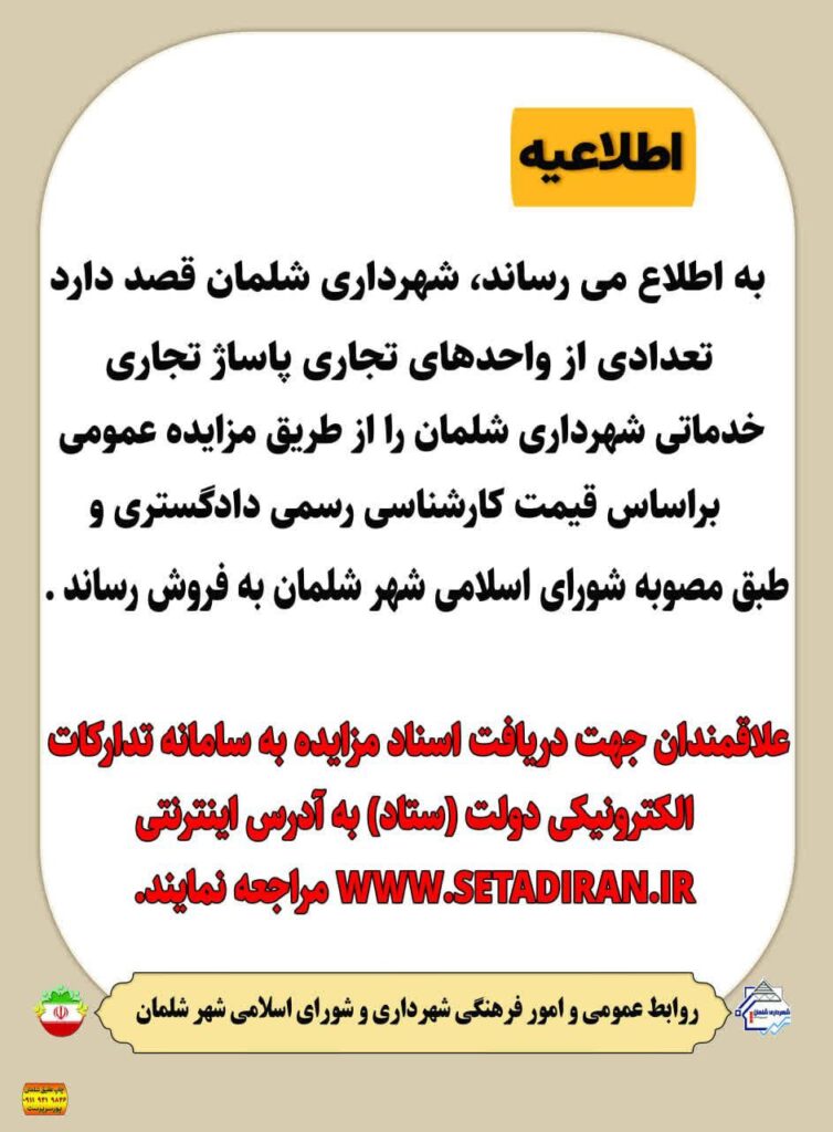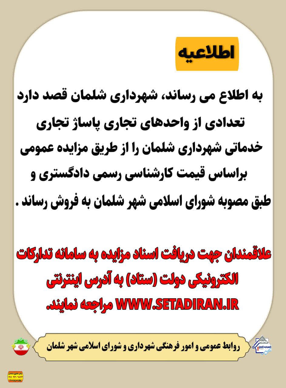 به اطلاع می رساند، شهرداری شلمان قصد دارد تعدادی از واحدهای تجاری پاساژ تجاری-خدماتی شهرداری شلمان را از طریق مزایده عمومی براساس قیمت کارشناسی رسمی دادگستری و طبق مصوبه شورای اسلامی شهر شلمان به فروش رساند