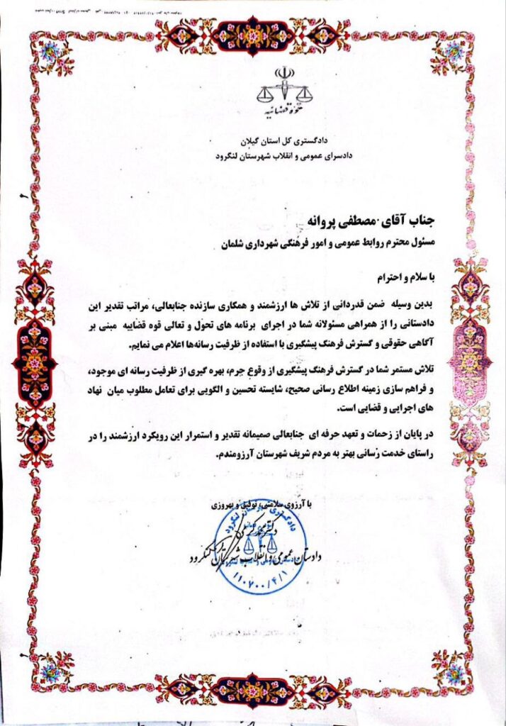 🔸صدای سکوت: دکتر محمّد کَرمی دادستان عمومی و انقلاب شهرستان لنگرود با حضور دکتر ایمان محمّدپور نیک بین شهردار شلمان از مُصطفی پَروانه مسئول روابط عمومی و امور فرهنگی شهرداری شلمان به دلیل همکاری مستمر در اجرای برنامه های تحول و تعالی قوه قضاییه جهت نشر آگاهی حقوقی و گسترش فرهنگ پیشگیری از وقوع جُرم با استفاده از اطلاع رسانی صحیح از فصای رسانه تجلیل کرد.