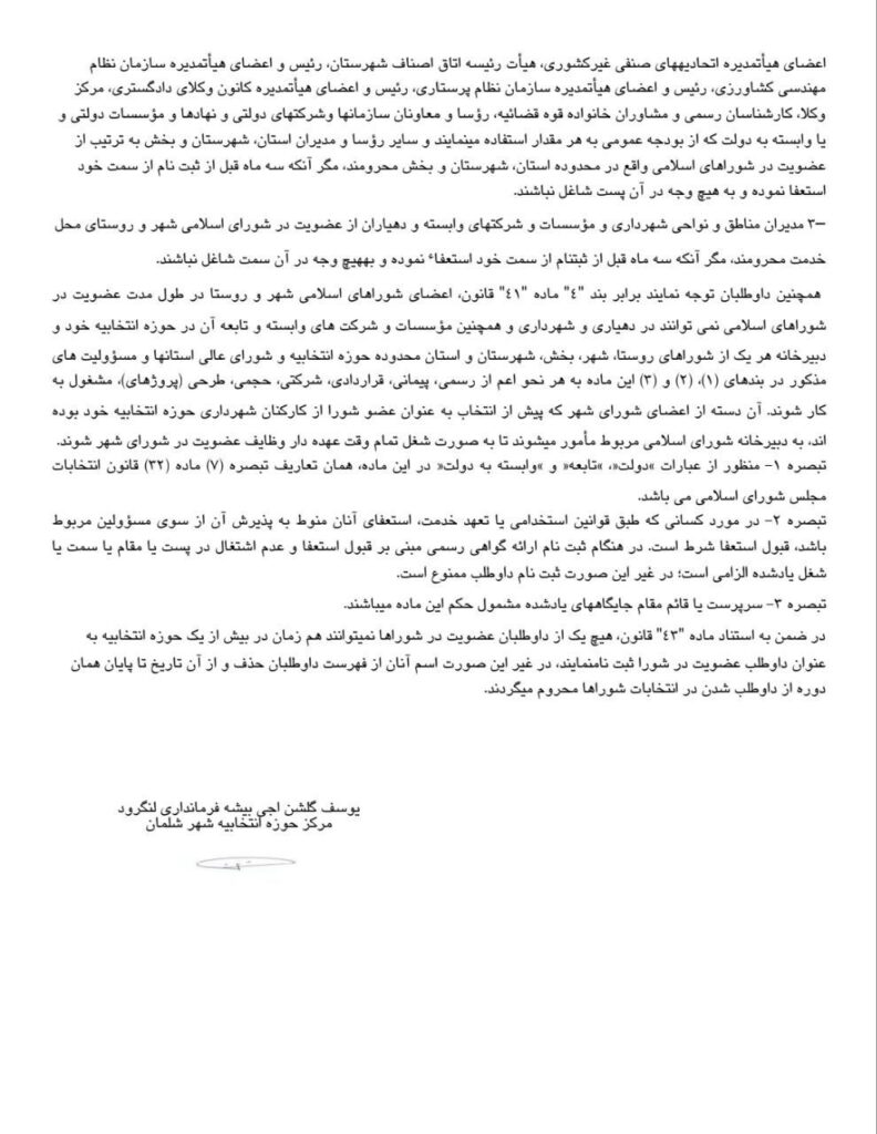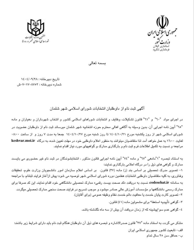 آگهی ثبت نام از داوطلبان هفتمین دوره انتخابات شورای اسلامی شهر شلمان
